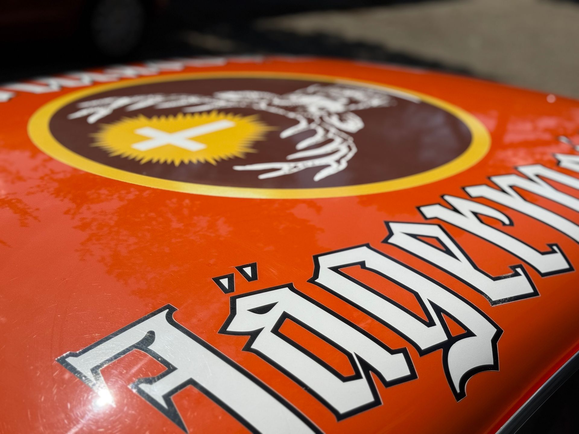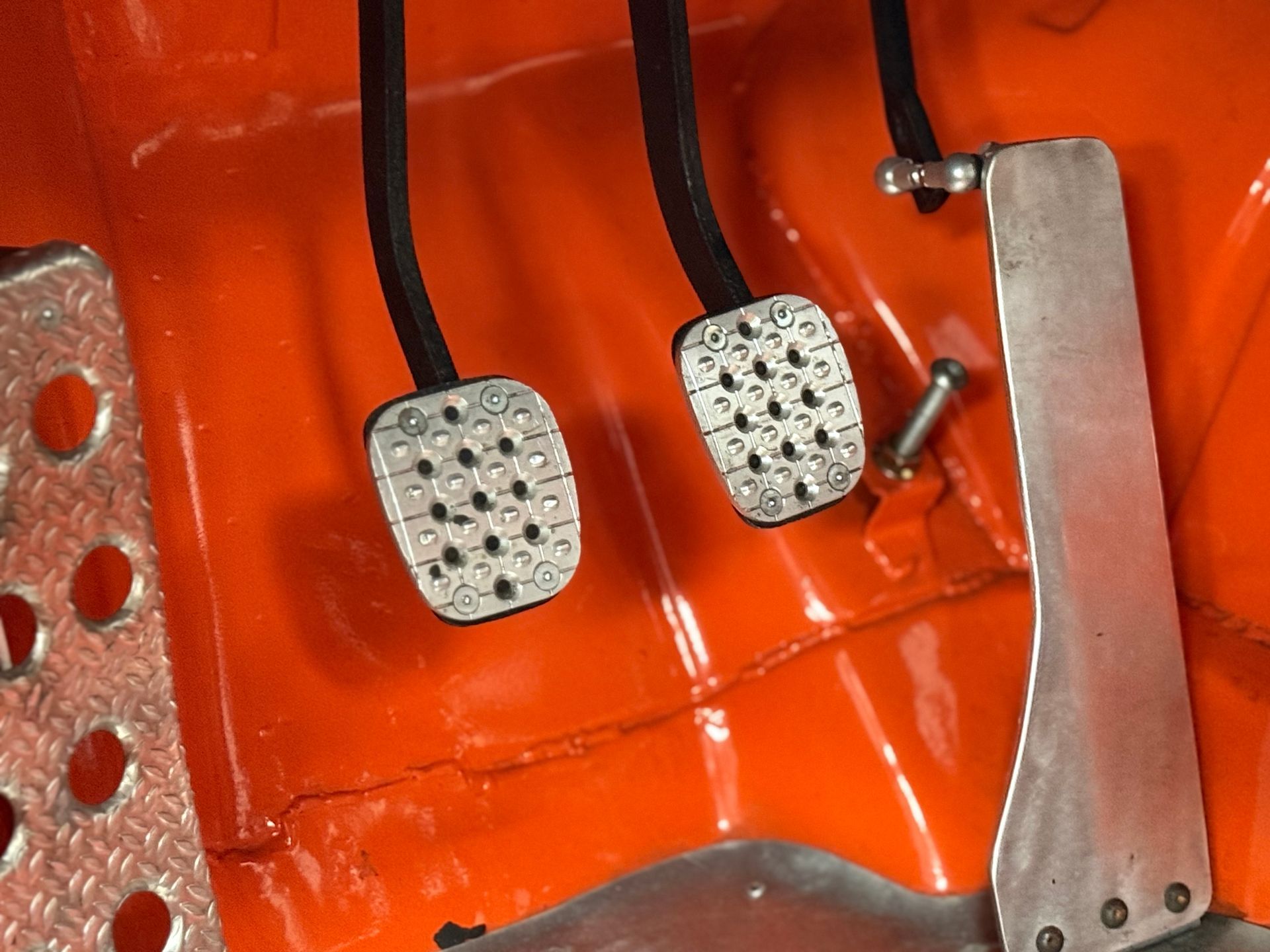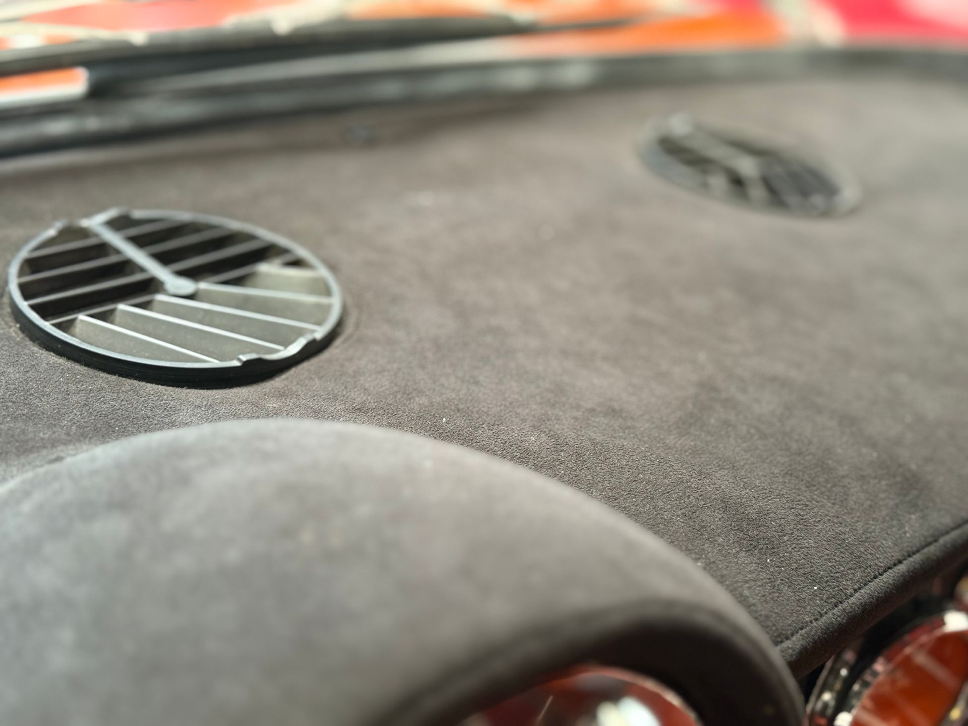 The cockpit is fitted with an original GTAm dashboard which has been covered and stitched with Alcantara and fitted with the original Oil Pressure / Temp Water / Benzine gauges – all work except for the fuel, which was never wired in on build. The gear stick has been extended Car is fitted with the original speedo. More importantly, on the left-hand side is a STACK 700 speedo with a digital display, which scrolls through various menus. There is a bespoke electric box mounted on tunnel floor with main ignition, stack menu button, fuel pump and cameras. Also, a GoPro on/off switch. Odyssey Extreme battery is installed under a cover plate in the spare wheel well.